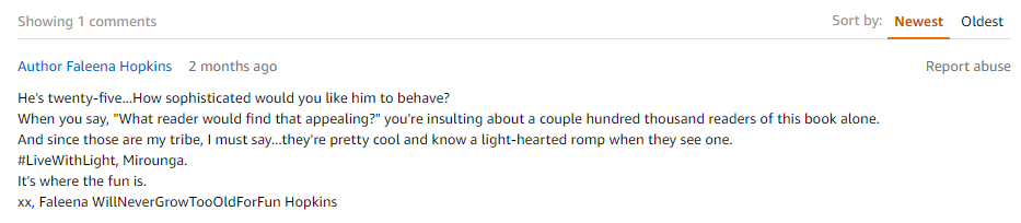 Obviously, when you piss off a bunch of well-meaning authors with such a ridiculous threat, hell burns loose and now she's pretty much alienated herself from the writing community and even people that previously read & enjoyed her books a long time before any of this mess happened.